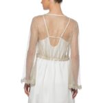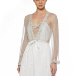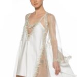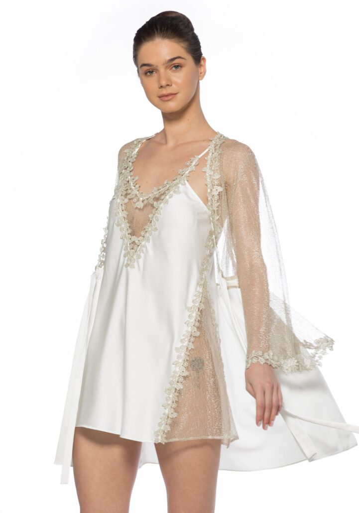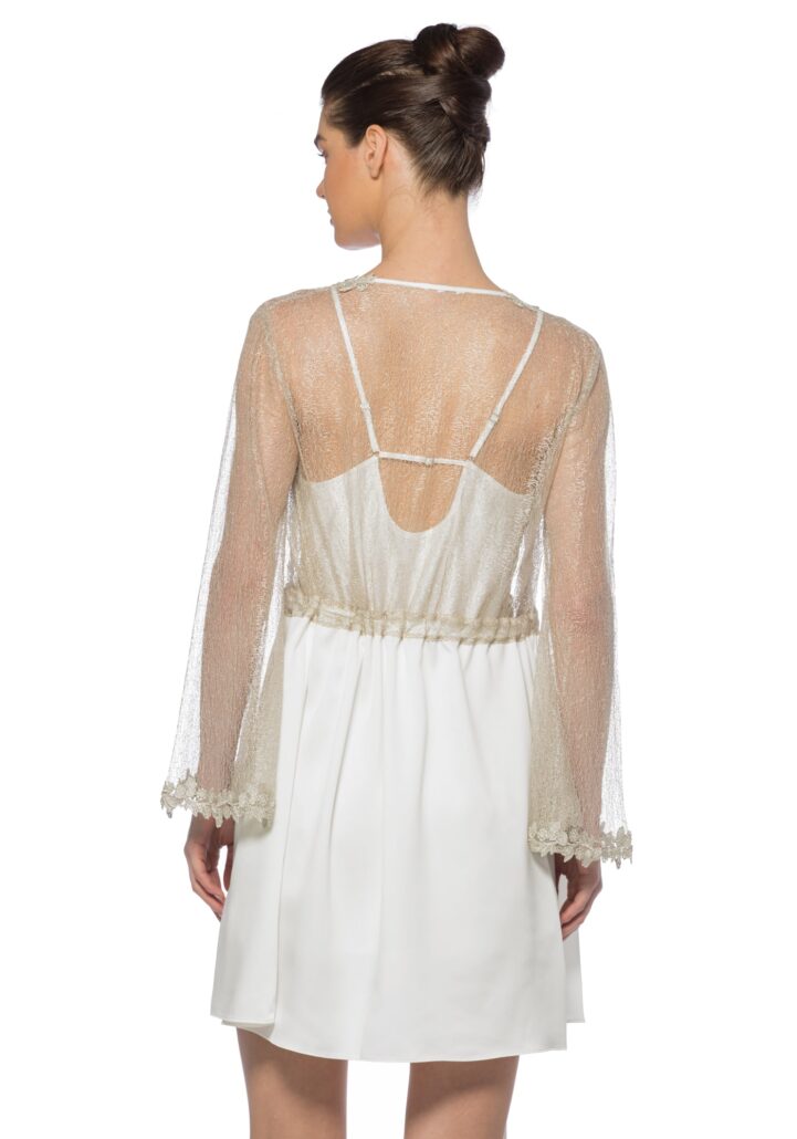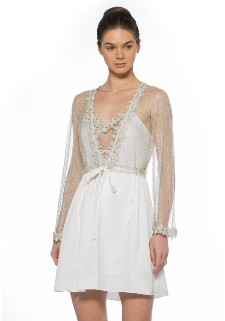 Your moonlit night wouldn’t be completed without Anastella Kimono with top silver lace panel and long bell-sleeves.